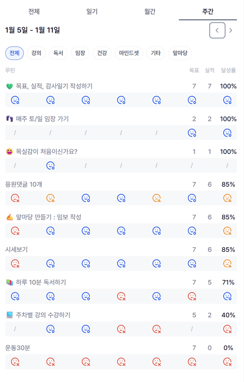 목실감을 5개월 정도 열심히 쓰고 있습니다. 하지만 그 동안의 목표를 수치화하지 못하고 있어서 매우 나자신이 안타까운 마음이 있습니다. 그래도 감사일기를 통해 하루 동안 내가 느낀 중요한 감정과 그것에 대해 복기하는 시간을 가질 수 있어서 매우 좋았습니다. 그 날 힘들었던 감정, 즐거웠던 감정, 감사했던 감정들을 정리하며 하루를 마무리하는 습관이 이제는 루틴이 되었습니다. 무엇보다도 나의 감정을 행동으로 옮기지 않고 절제와 자제를 할수 있게 되었고 감정에 흔들리지 않게 되었습니다.
