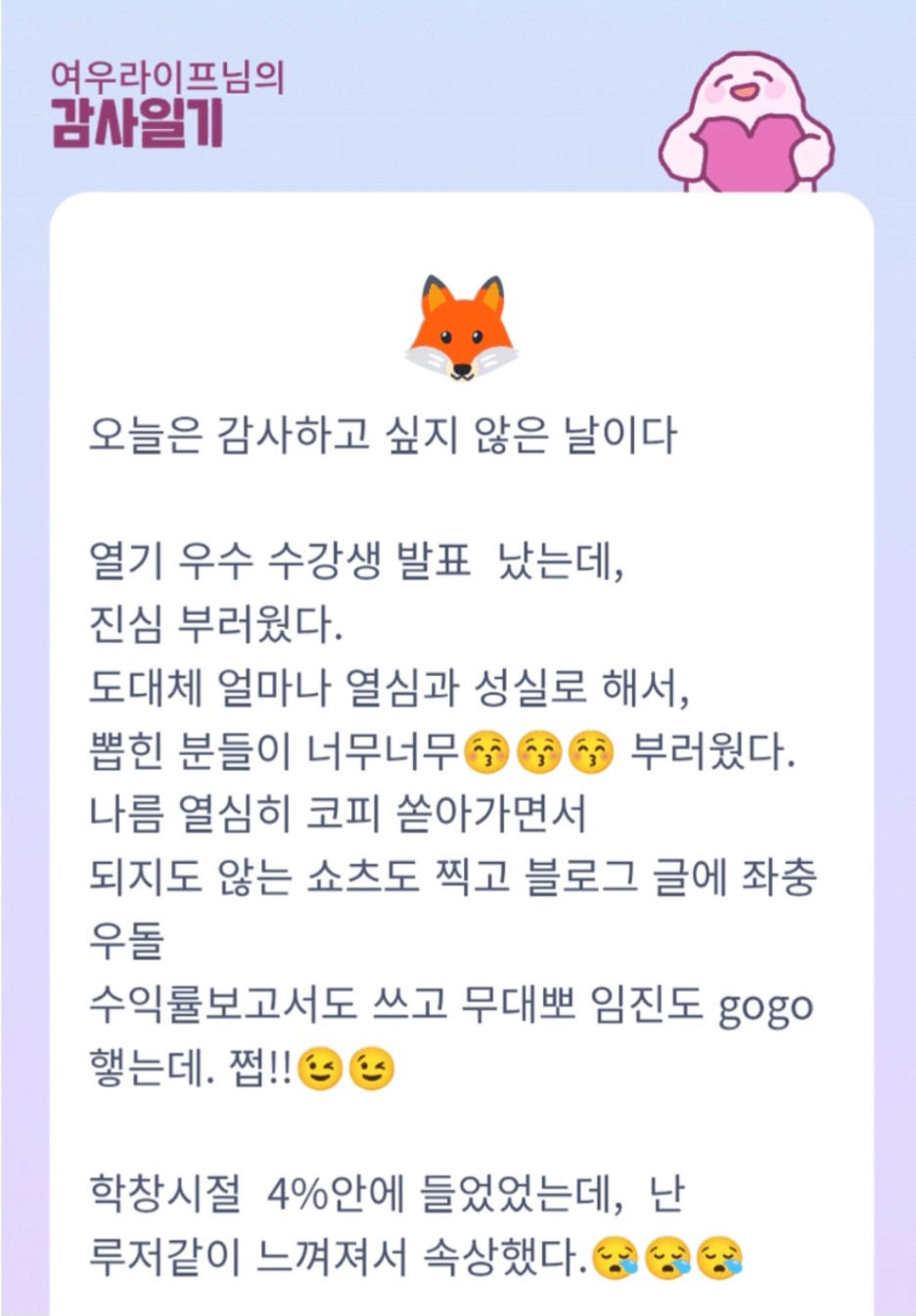 우와~~여우라이프님~ 2호기에 이어 3호기까지!! 이렇게 진심을 가득 감사일기를 쓰시며 하나하나 해나가셨군요! 챗봇활용한 부분도 너무 신기하고 멋지십니다~! 고생 많으셨습니다! 2,3호기 축하드려요!!!+_+!