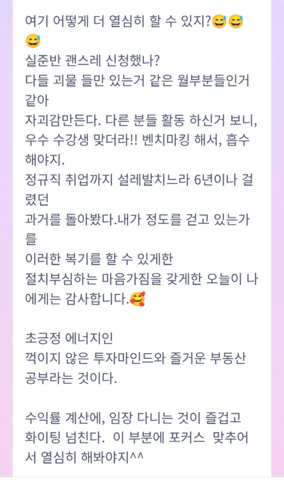 부동산 투자 공부가 힘들다기 보다는 즐거웠습니다.