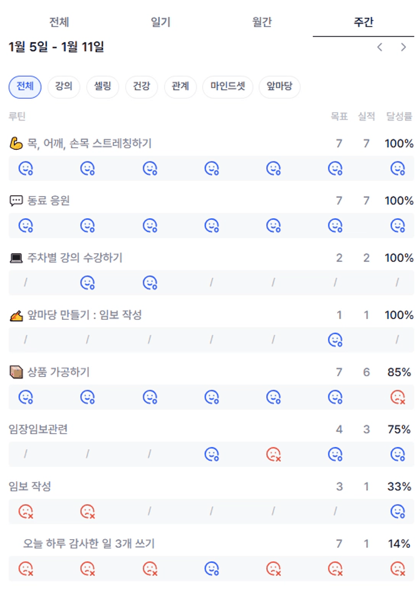 예) 토요일부터 목요일까지 목실감을 쭉 하루하루 적어보면서 스스로 중요한 부분은 놓치지 않고 해낸 것 같아 뿌듯하다.