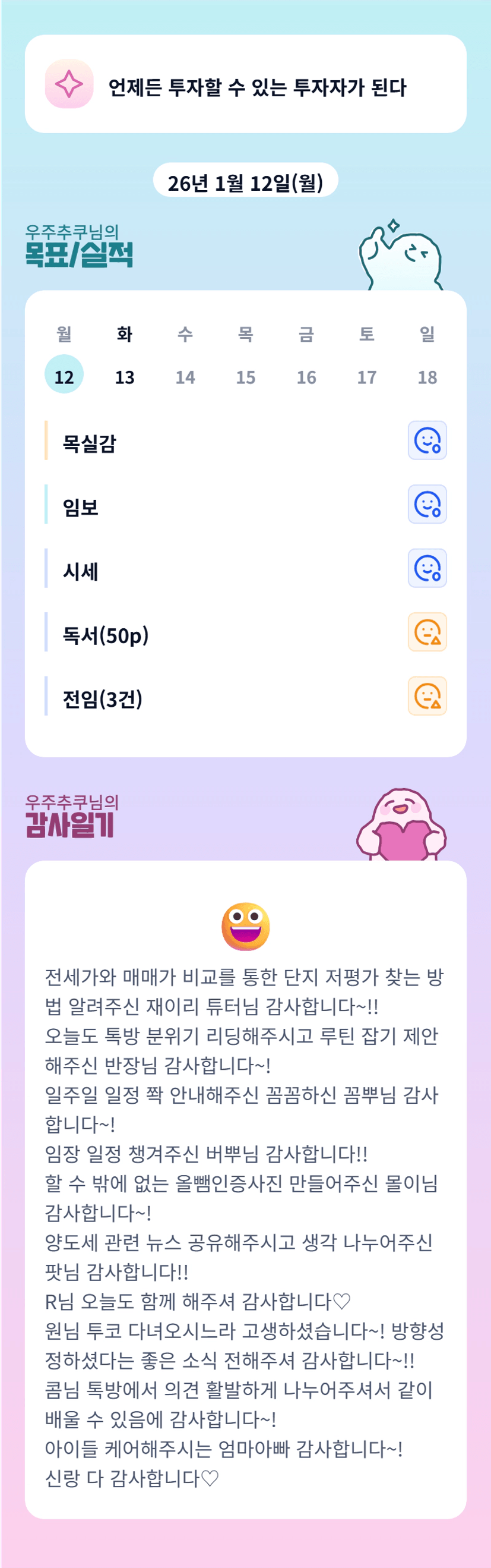 감일 보며 계속 감동받다가 마지막에 또 뭉클... ㅜㅜㅜ 많은 것에 감사하는 추쿠님 멋지네요오!! 우리 반 분위기 메이커 맡아주시고 루틴도 함께해주시는 ><ㅋㅋㅋㅋㅋㅋㅋㅋㅋㅋㅋㅋ 감사한 추쿠님~~~ 오늘도 넘 넘 고생많으셨어요! 얼른 주무셔요 :)