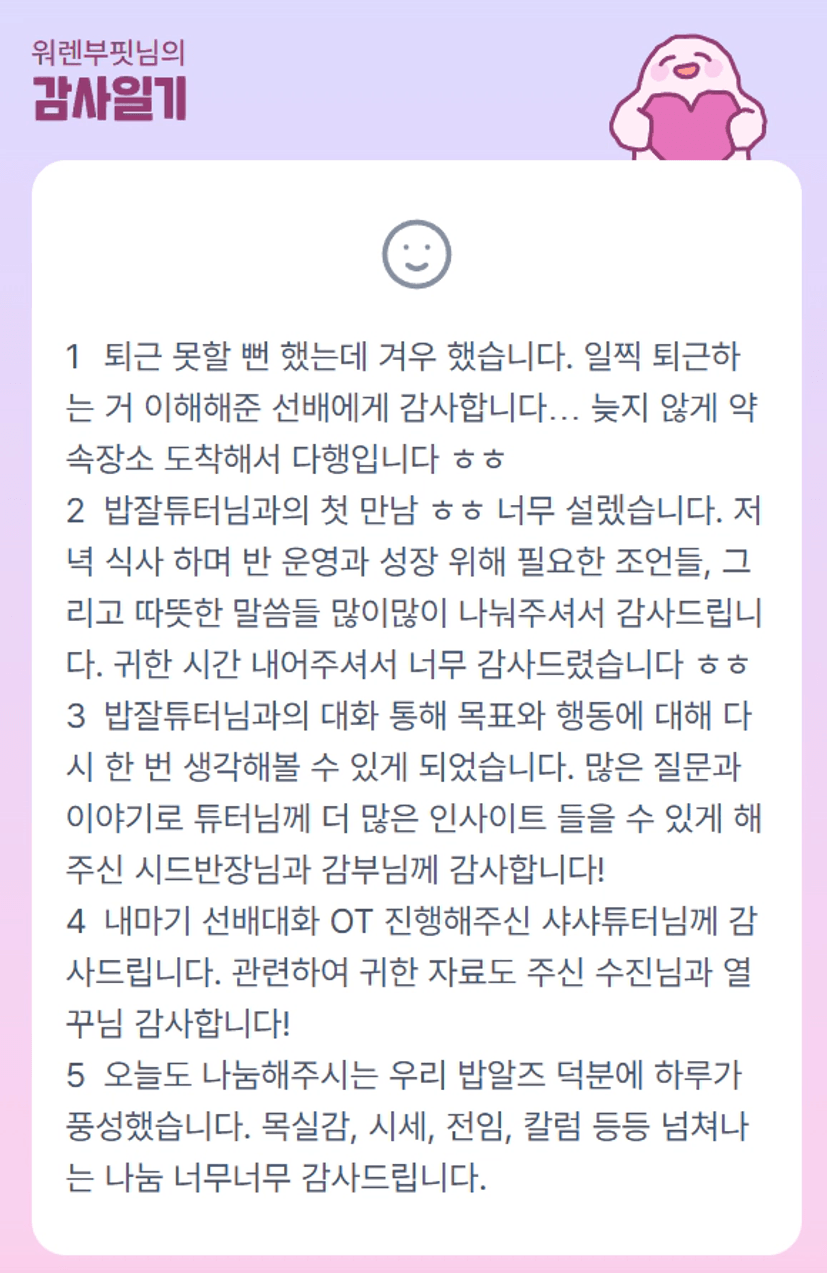 밥잘튜터님과의 시간 너무 좋았겠네용!!🙏 바쁜와중에 일정도 챙기고 반원분들도 챙겨주시고 튜터님과의 소통도 신경써주셔서 감사합니다 부핏님💙