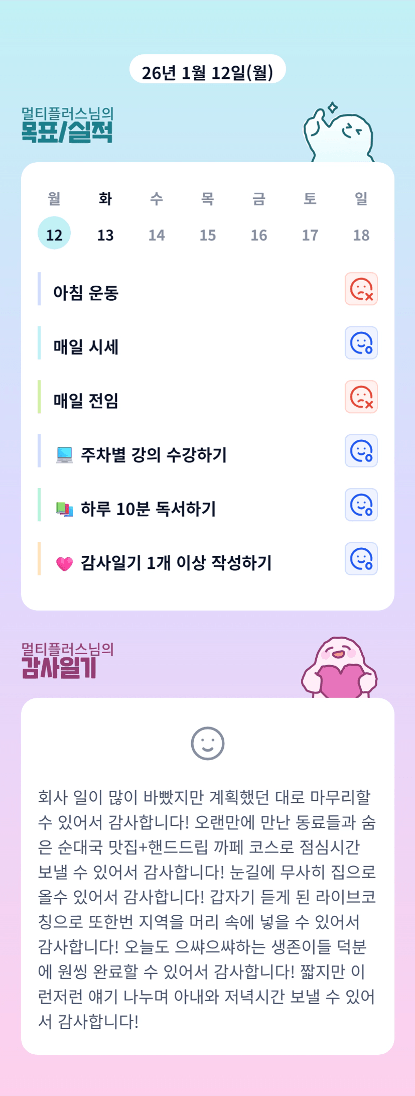 멀티님~~ 꽉꽉 채운 하루 보내셨네요 월요일 고생 많으셨어요!! 함께 하는 생존이들 덕분에 저도 늦게나마 해야할 일들 해냈네요 ㅎㅎㅎ 오늘도 컨디션 관리 잘 하시면서 원씽 화이팅입니다!! 가주아~!