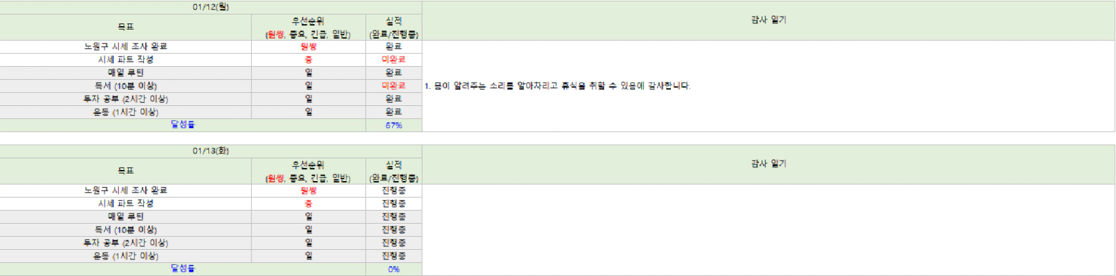 🌻1/13 목표, 1/12 실적 & 감사일기