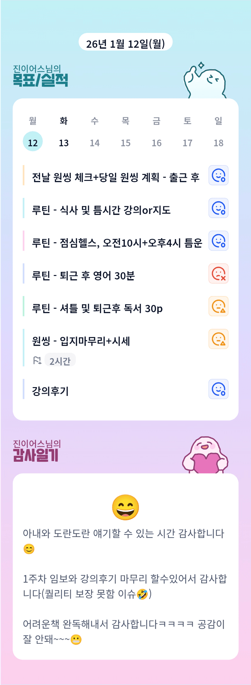 완료! 완료! 루틴에 맞게 하나하나 해내시는 어스님 화이팅입니다!!