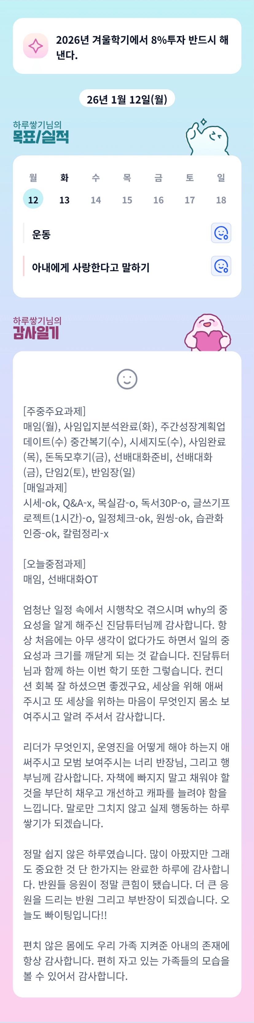 할 일이 산더미일 때 몸이 고장나면 막막하고 화도 나는데 그 상황에서 소통도 잘해주시고 할일 정리해서 뙇뙇 마무리하신 쌓부님 멋지십니다!!👍🏻👍🏻 오늘 좀 나아지셧기를요 고생하셨어용☺️☺️