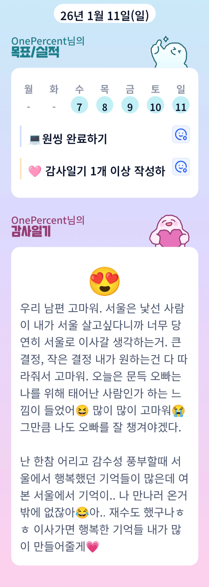 감사일기를 쓰니 그냥 흘려보낼 뻔한 소중한 순간들을 생각하며 행복해지는 것 같다.