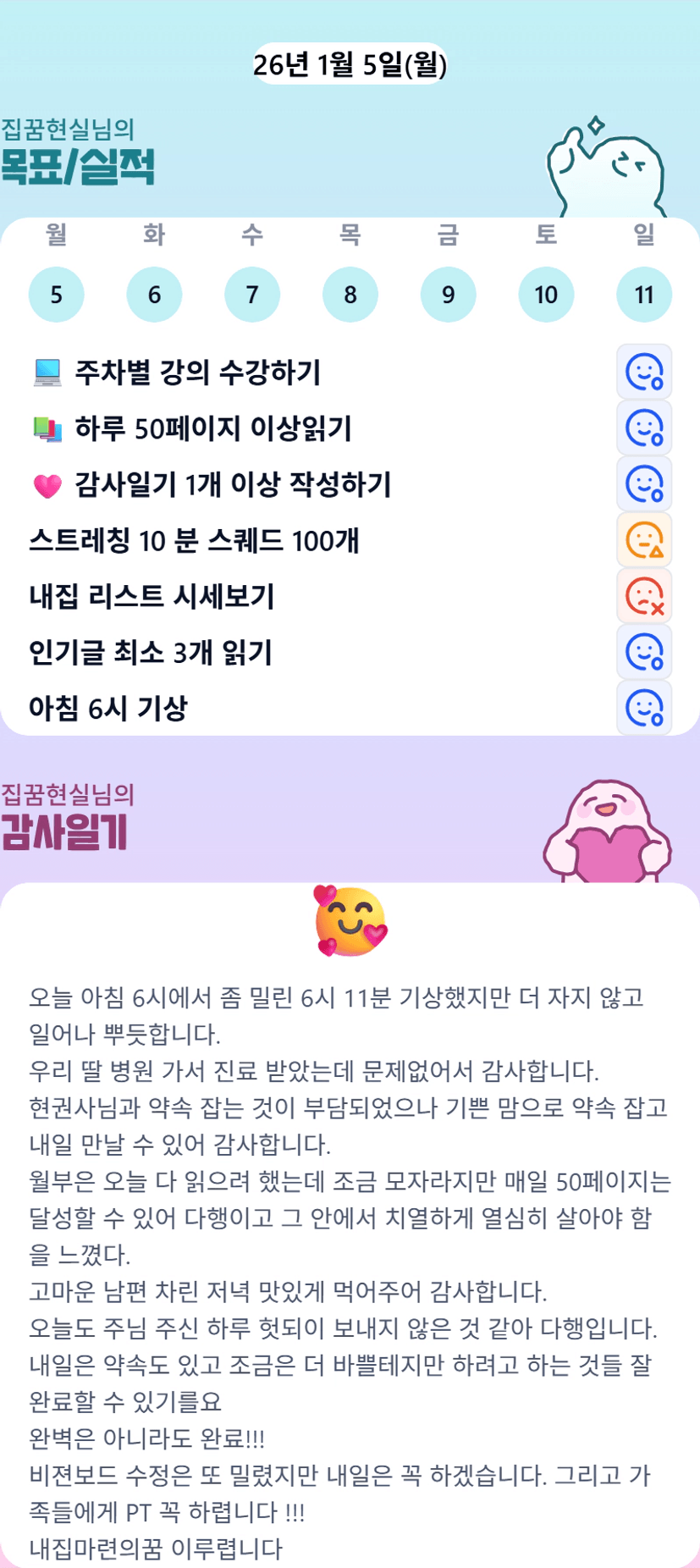 1주일 내가 뭘했고 뭘 안했는지를 알 수 있어 반성하고 다시 동기부여하기에 좋다