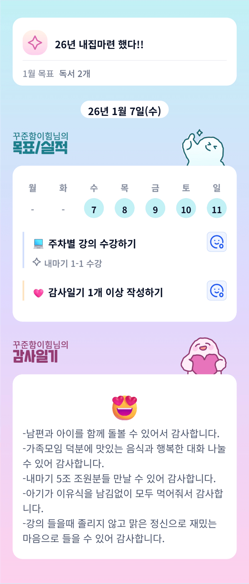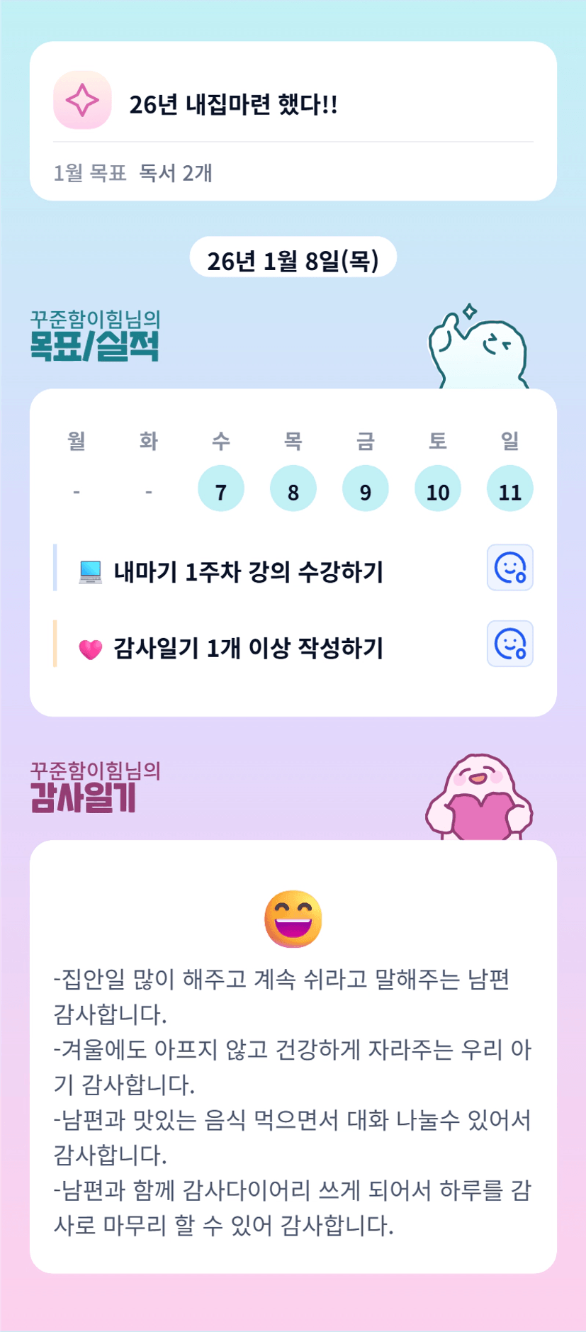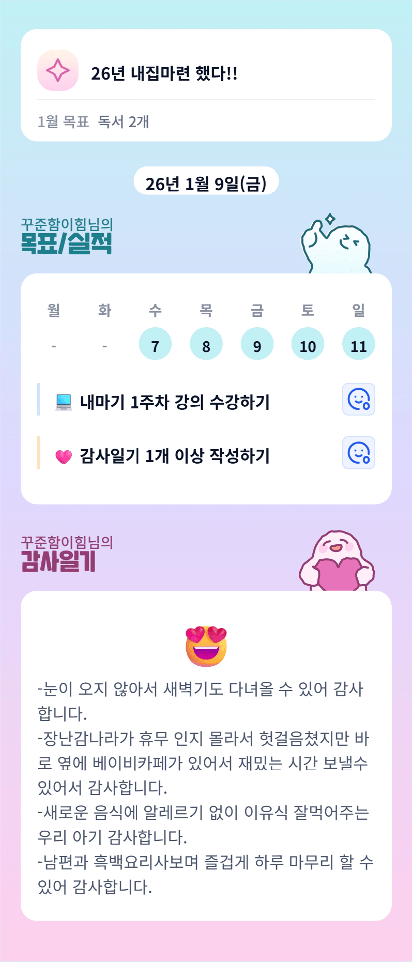 - 하루를 감사로 마무리 하다보니 힘든일들만 보고 생각하기 보다 힘들지만 감사한 일을 떠올리며 하루를 마무리 할 수 있어 좋았습니다.