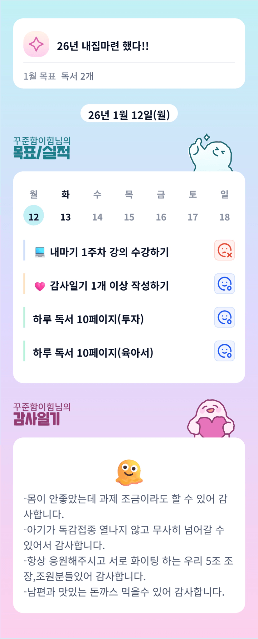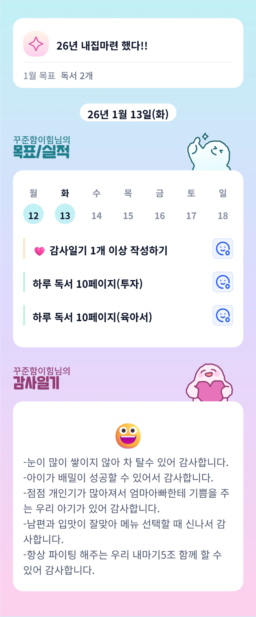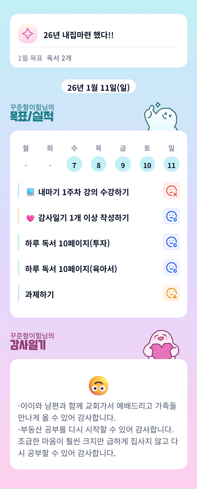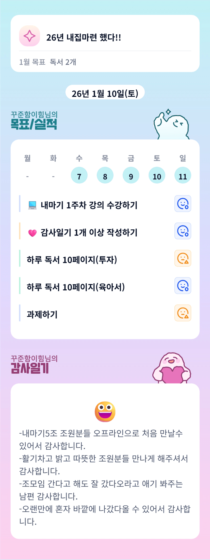 - 하루를 감사로 마무리 하다보니 힘든일들만 보고 생각하기 보다 힘들지만 감사한 일을 떠올리며 하루를 마무리 할 수 있어 좋았습니다.