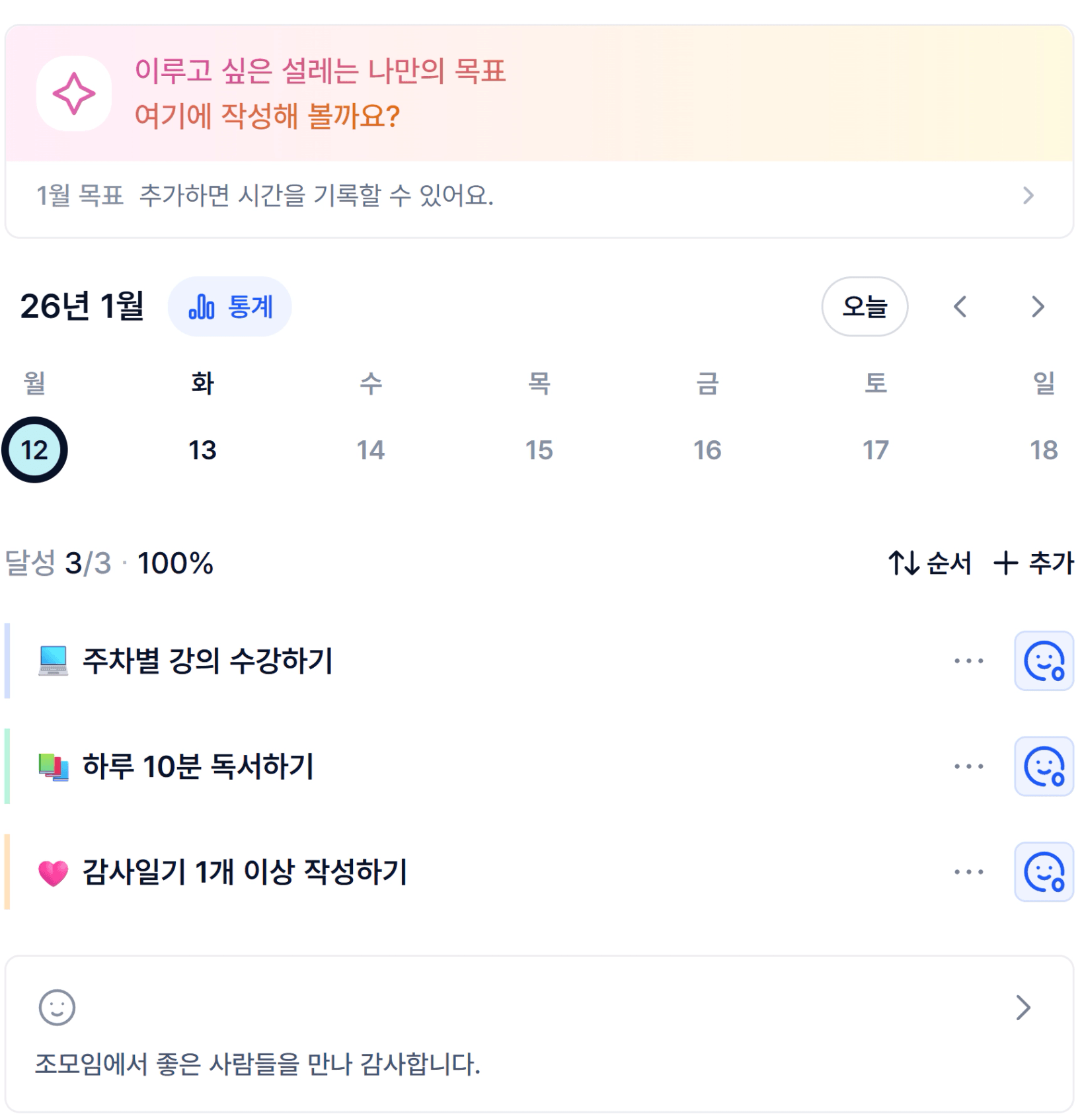 하루하루 달성한 것들을 스스로 돌아볼 수 있어 성취감을 느낄 수 있었습니다.