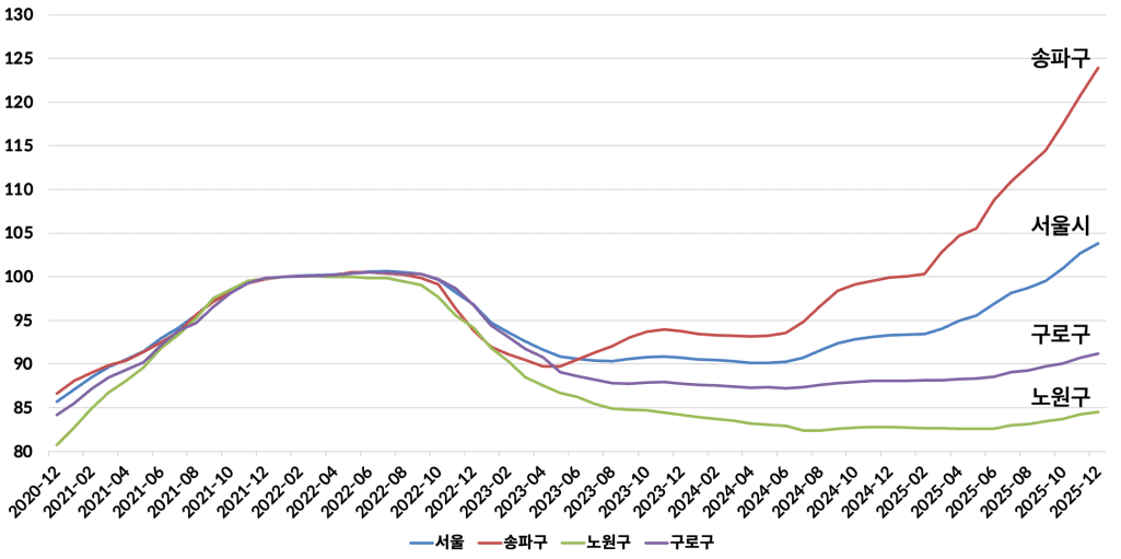 송파구는 서울 평균 이상의 급격한 상승세를 보입니다.