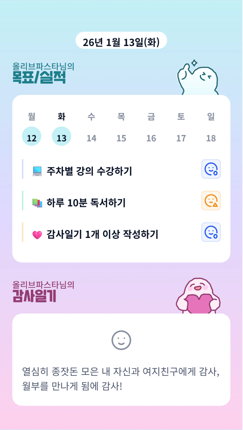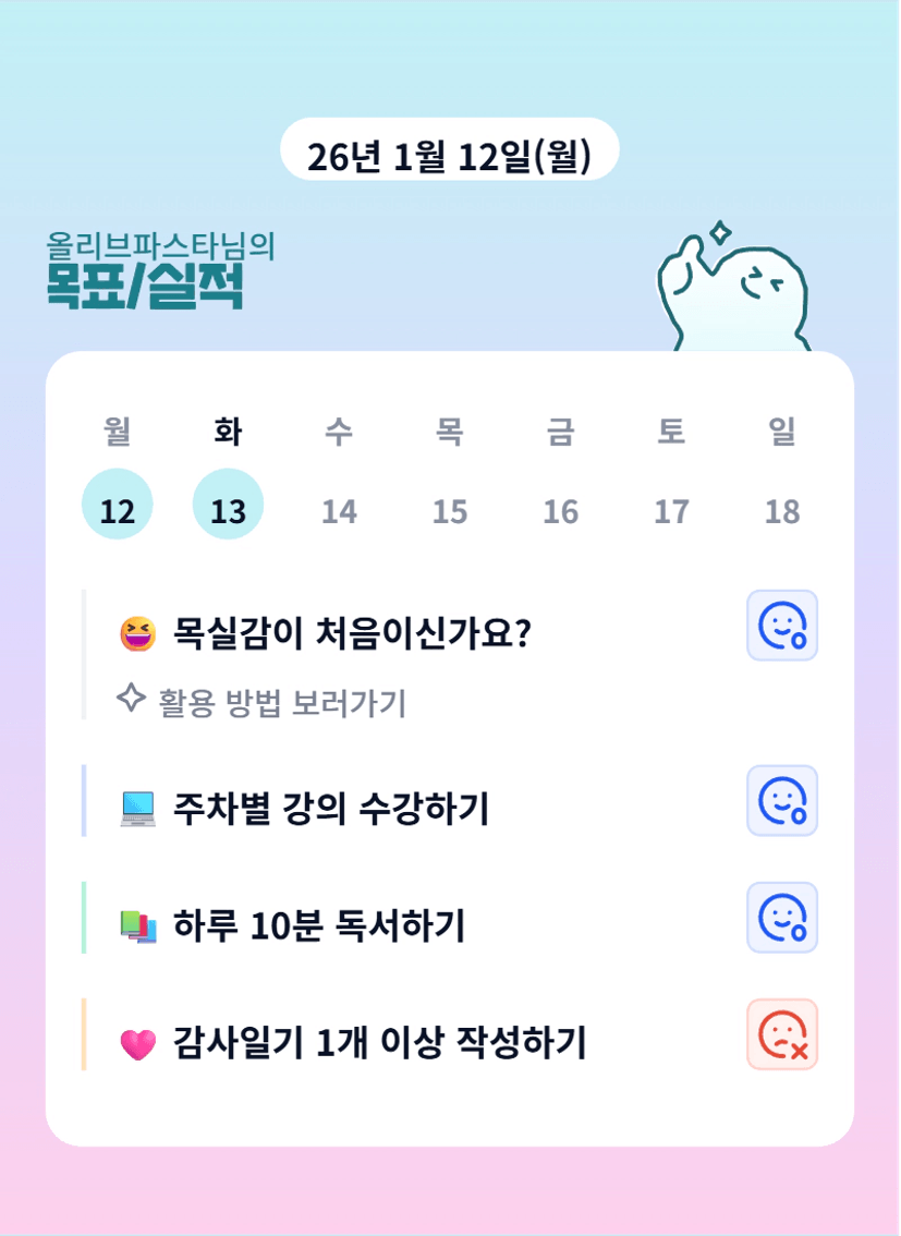 목실감은 일일 단위 목표를 세우고 날마다 체크할 수 있어서 내 하루를 더 신경쓰게 되고 더욱 열심히 살 수 있게 해준다!