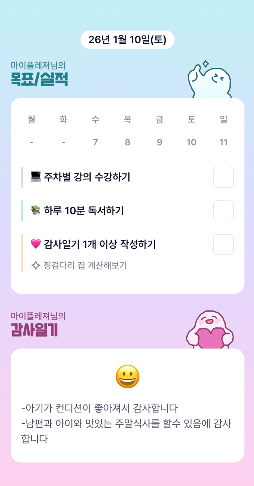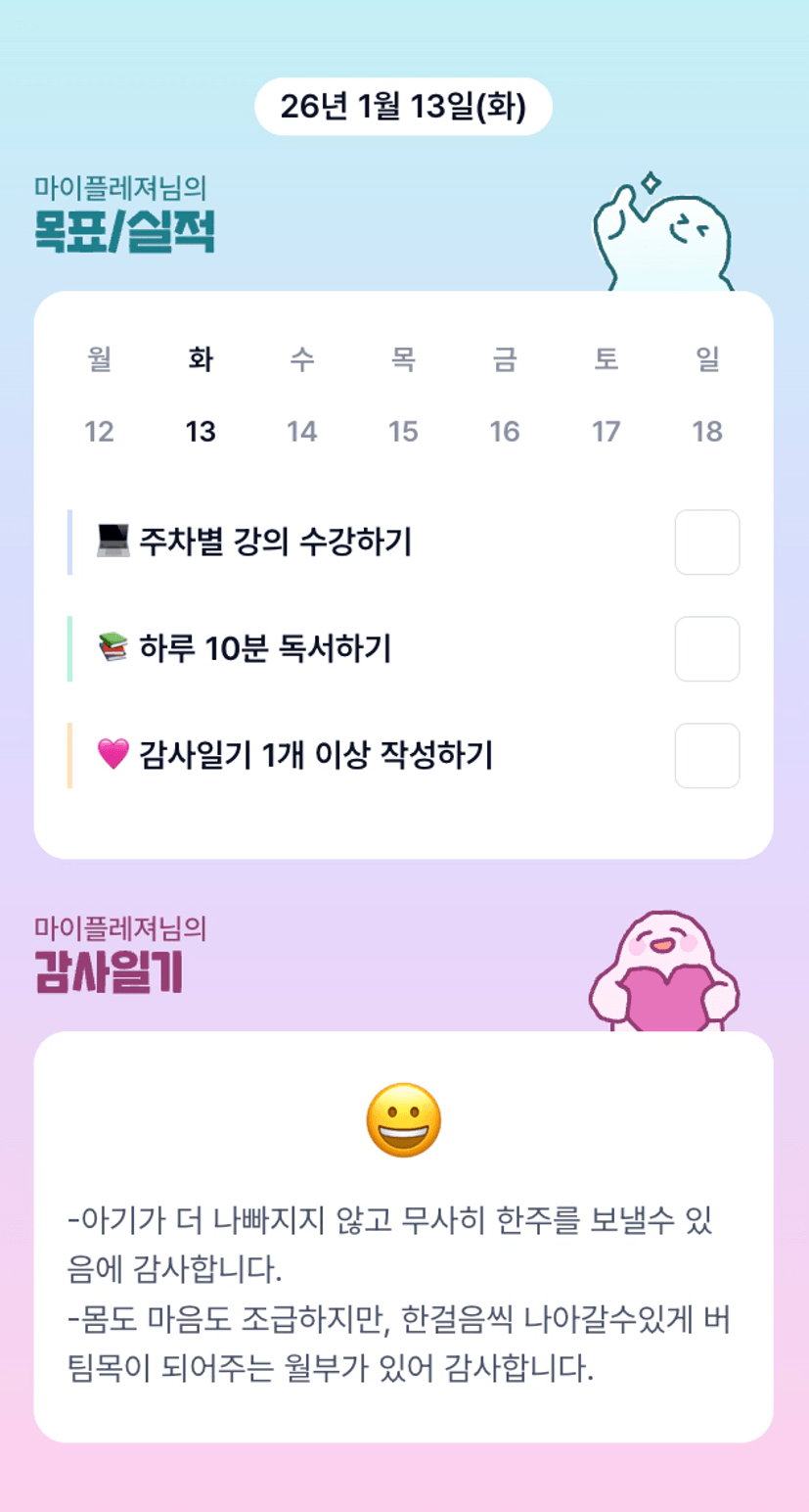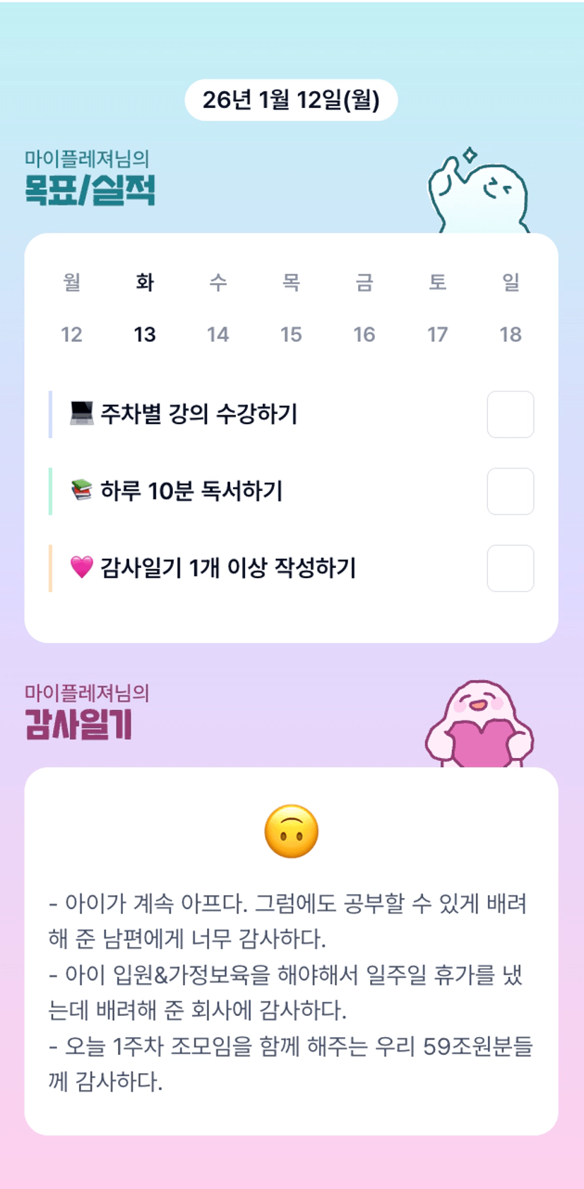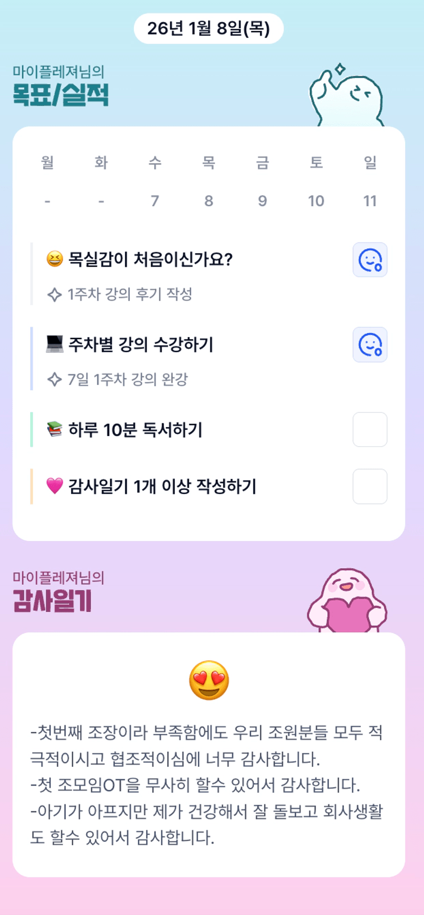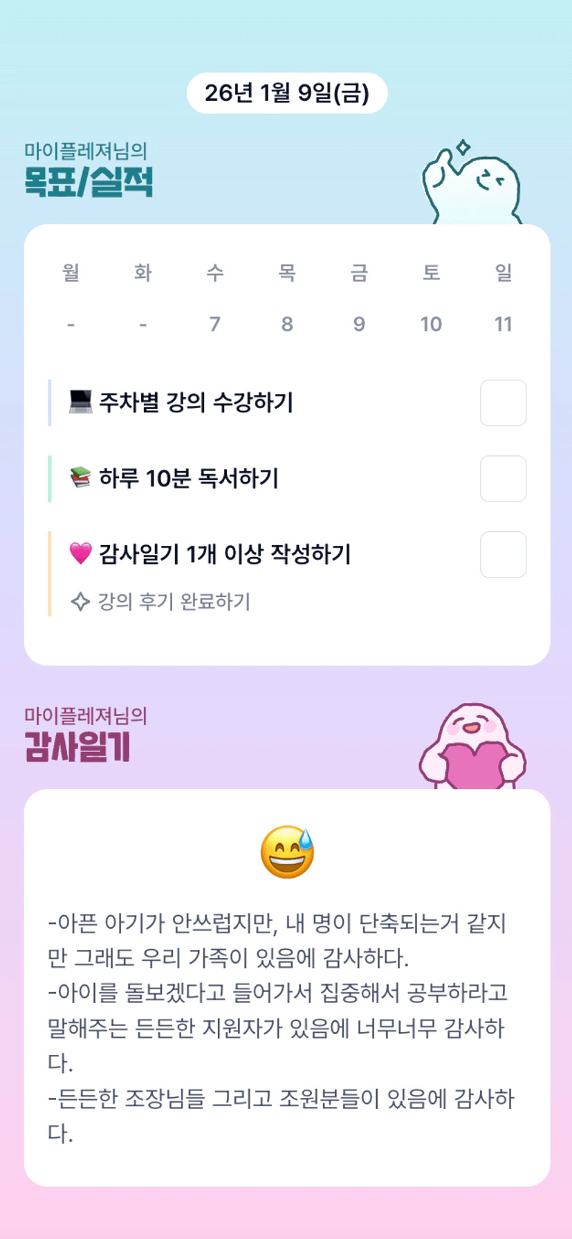 이번주엔 지난주 수요일 강의 올라오자마자 당일 모두 수강했고 2회차는 중간중간 시간날때마다 해서 감사일기만 썼는데, 2주차는 목표/실적/감사 함께 잘 작성해보고자 한다.