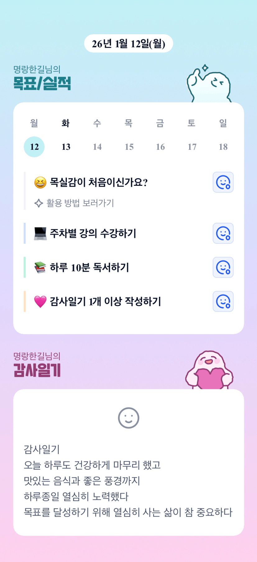 목실감 작성만으로도 의지가 생기고, 하루 하루 해낸 것이 있다는 생각에 힘이난다