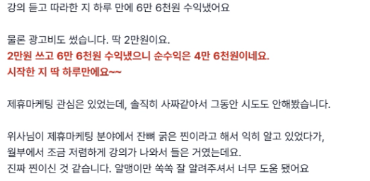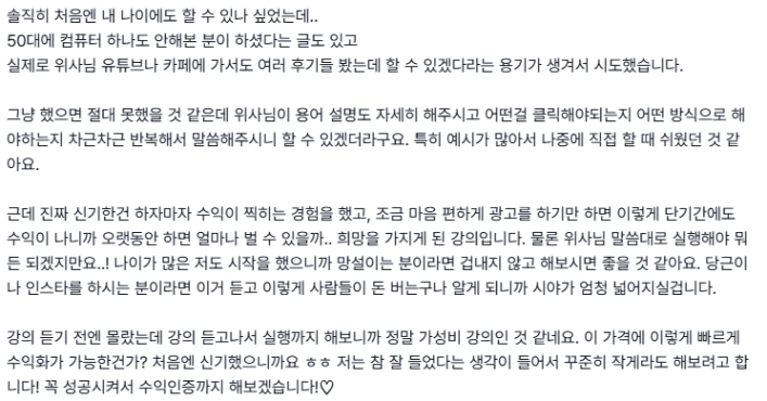 대부분 많은 분들이 ‘얼마만에 수익이 나나요?’ 물어보십니다. 사람마다 다 속도가 다르지만, 빠르게 나는 분은 하자마자 나실 수도 있다고 말씀드려요.