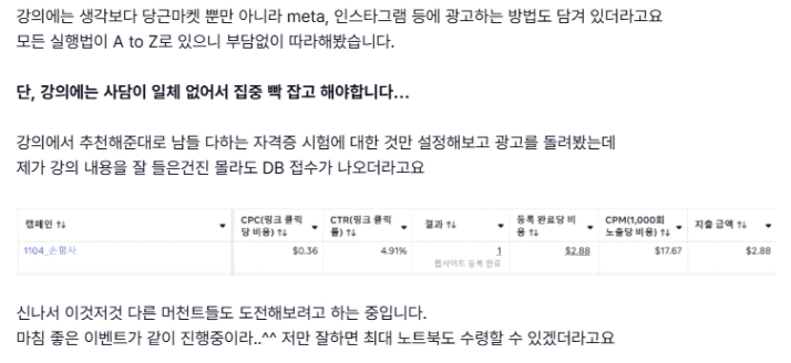 강의를 듣고, 바로 실행하시는 분들이 속도가 빠른 경우가 대부분이더라구요. 강의를 듣는 것에 만족하지 않고 성과를 내기 위해 시도를 하고, 그 첫번째 시도가 성과가 나지 않더라도 잘 해내기 위해 또 다시 해보는 것. 실망하고 좌절하기보단 개선하기 위한 시도를 해보는 것입니다.