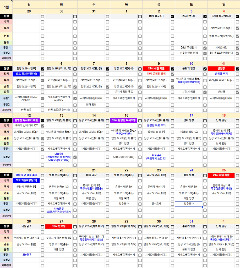 아래는 저의 1월 원씽캘린더인데요!