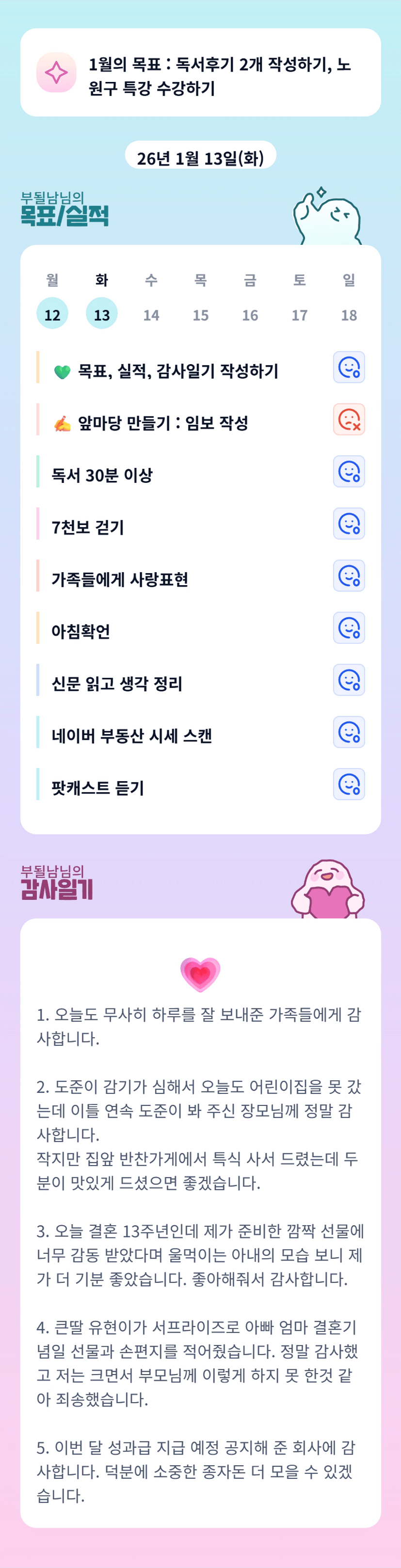 도준이 아프지말고 얼른 낫고, 결혼기념일 멋지게 서프라이즈 성공한 부될남님과 따님 두 분의 따뜻함이 많이 닮으셨네요 ㅎㅎ 상반기가 끝나기 전에 많이 도와주신 장모님과 작은 여행(?)이라도 가심이 어떠신지 조심스레 추천드려봅니다! 미래에 받으실 성과급도 축하드려요! 부될남님의 하루를 레버리지하러 자주 오겠습니다 ㅎㅎㅎ