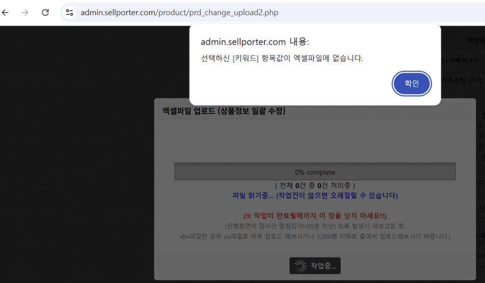 키워드 가공 및 마이카테고리까지 모두 마친 후 엑셀파일 업로드 시도 시 계속 “선택하신 [키워드] 항목값이 엑셀파일에 없습니다” 메세지와 함께 파일 업로드를 계속 못하고 있는데 이거 어떻게 해야 하나요?