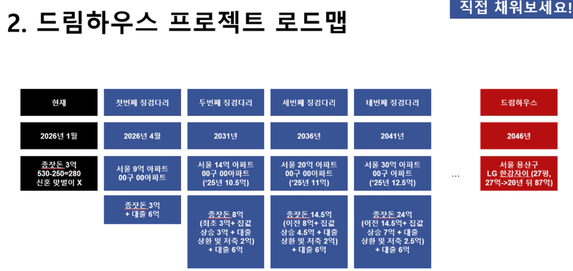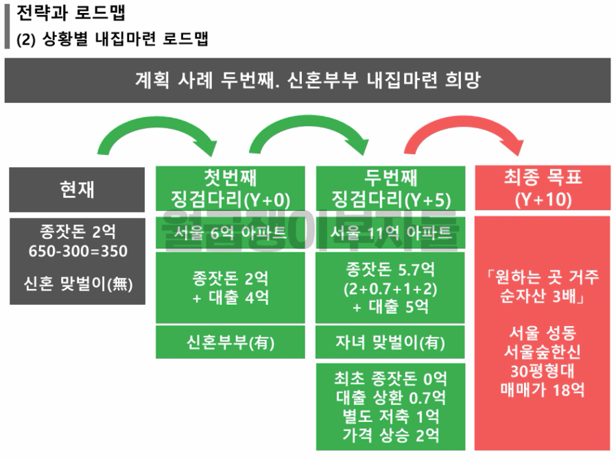 강의에서는 아래와 같이 5년 단위로 2~3번을 갈아타다보면 부동산 가격이 상승 & 내가 일으킨 대출 레버리지 효과와 기타 저축을 통해서 훨씬 비싼 집으로 이동할 수 있다고 알려주셨습니다.