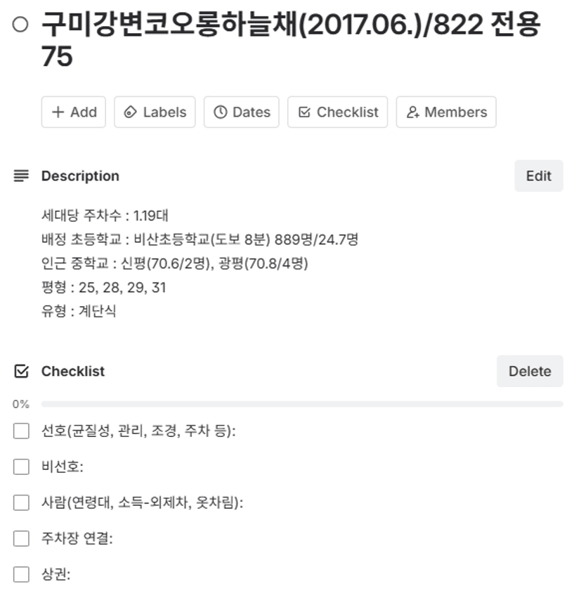 트렐로에서 단지 카드를 만들어 단지 임장 중 파악한 내용을 기록하는 방법입니다.