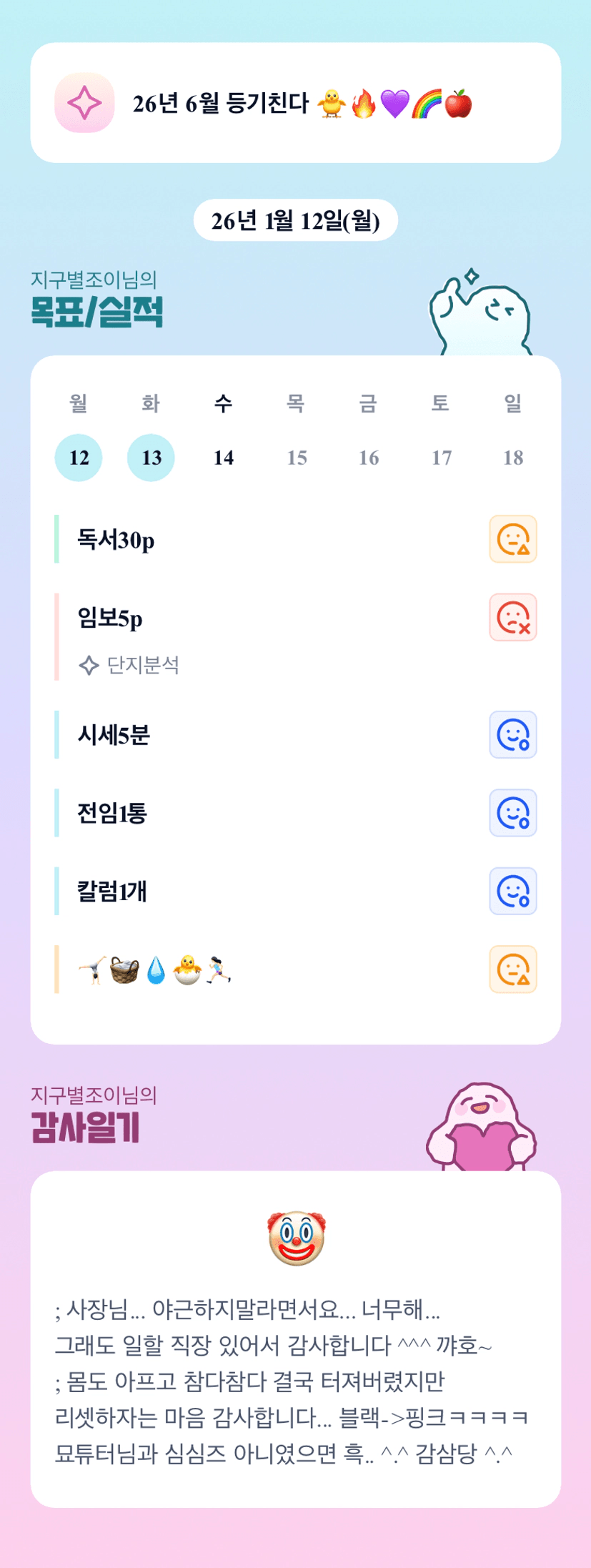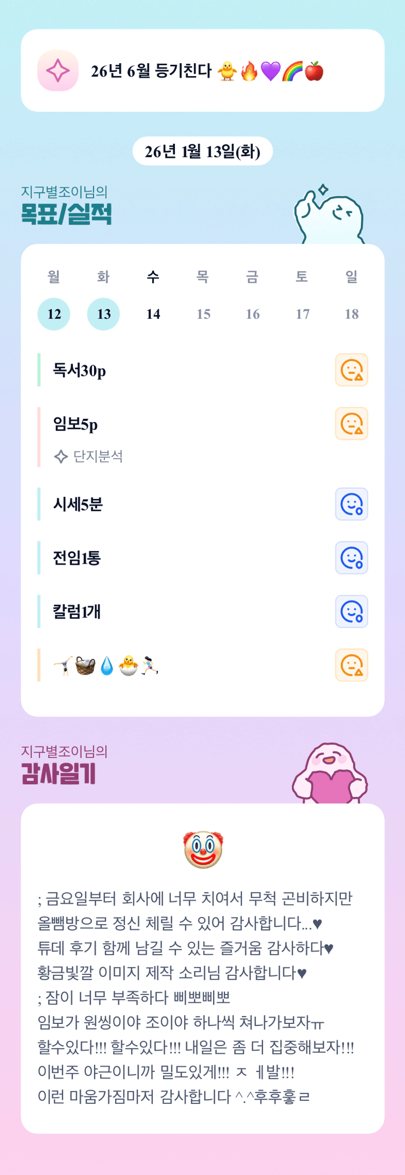 조이님ㅜㅜ 몸 안좋으세요? 야근하다보면 원씽챙기기 당연히 힘들어지는데 너무 무리하지말고 평일은 할수있는 만큼만 하시고 주무셔요😭