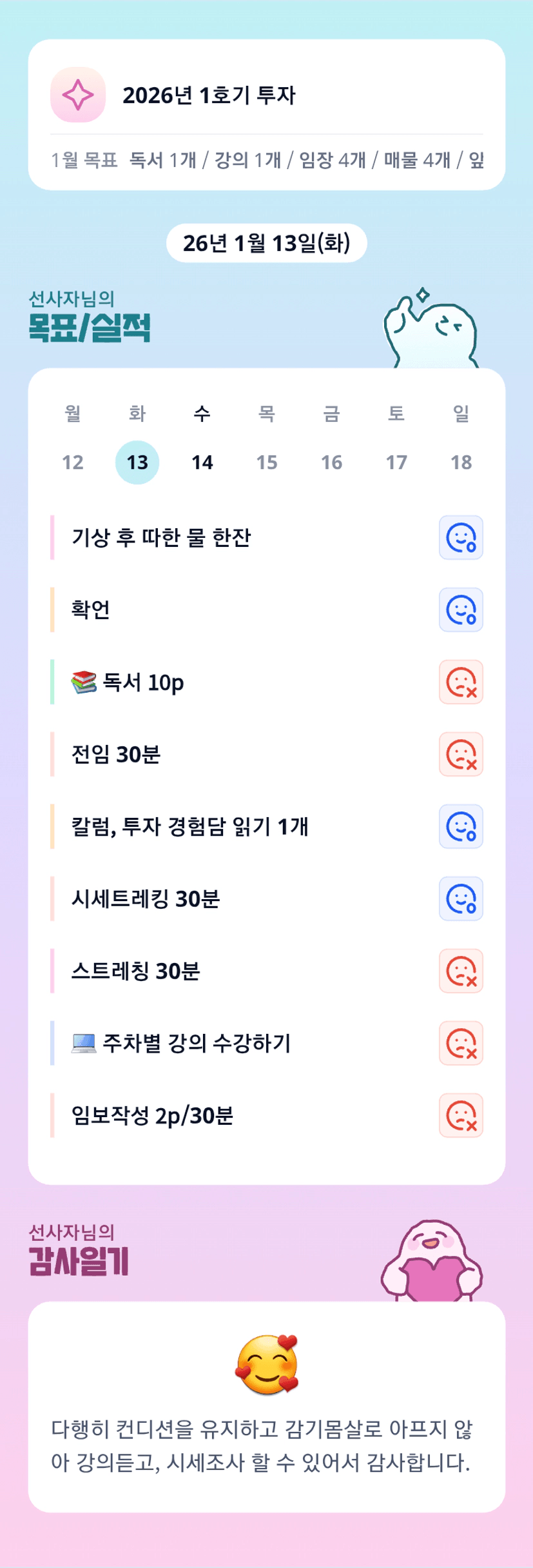 선사자님~~~ 바쁘신 와중에도 조모임 참여해주시고 계속해서 해나가주셔서 감사합니다💛 오늘도 컨디션 잘 챙겨서 화이팅하셔요~💕