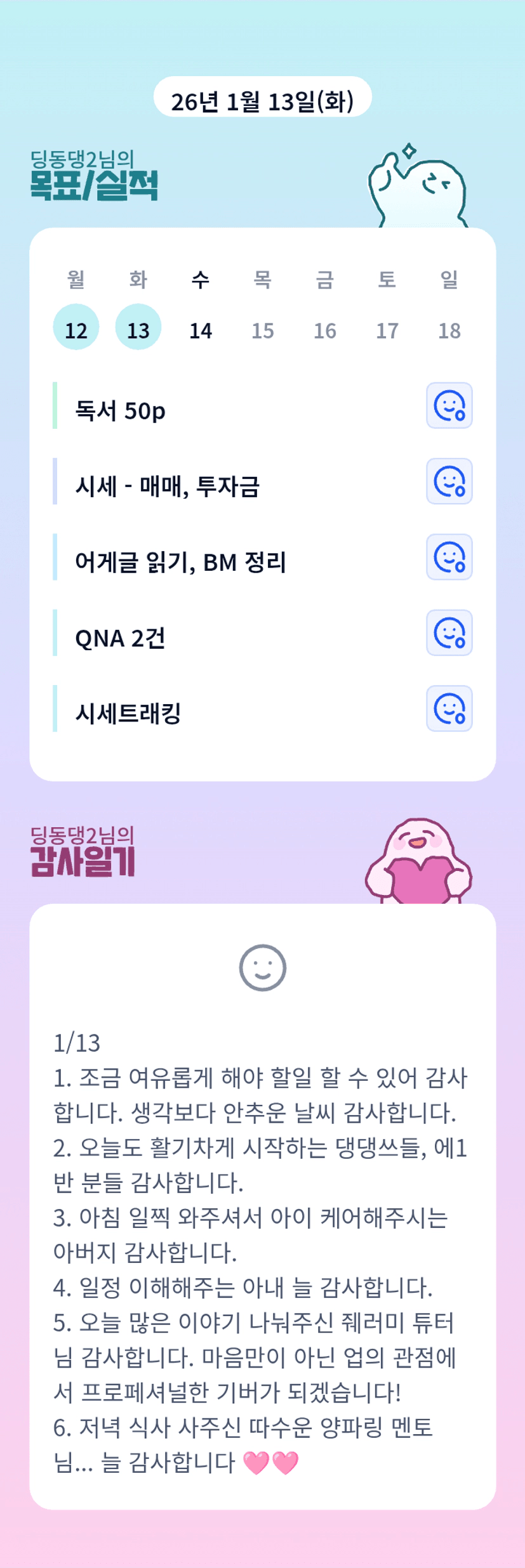 ❄️1/13 계획- 투자복기 2H O- 강의계획서 2H △- 나눔글1 2H X- 전임10 1H △