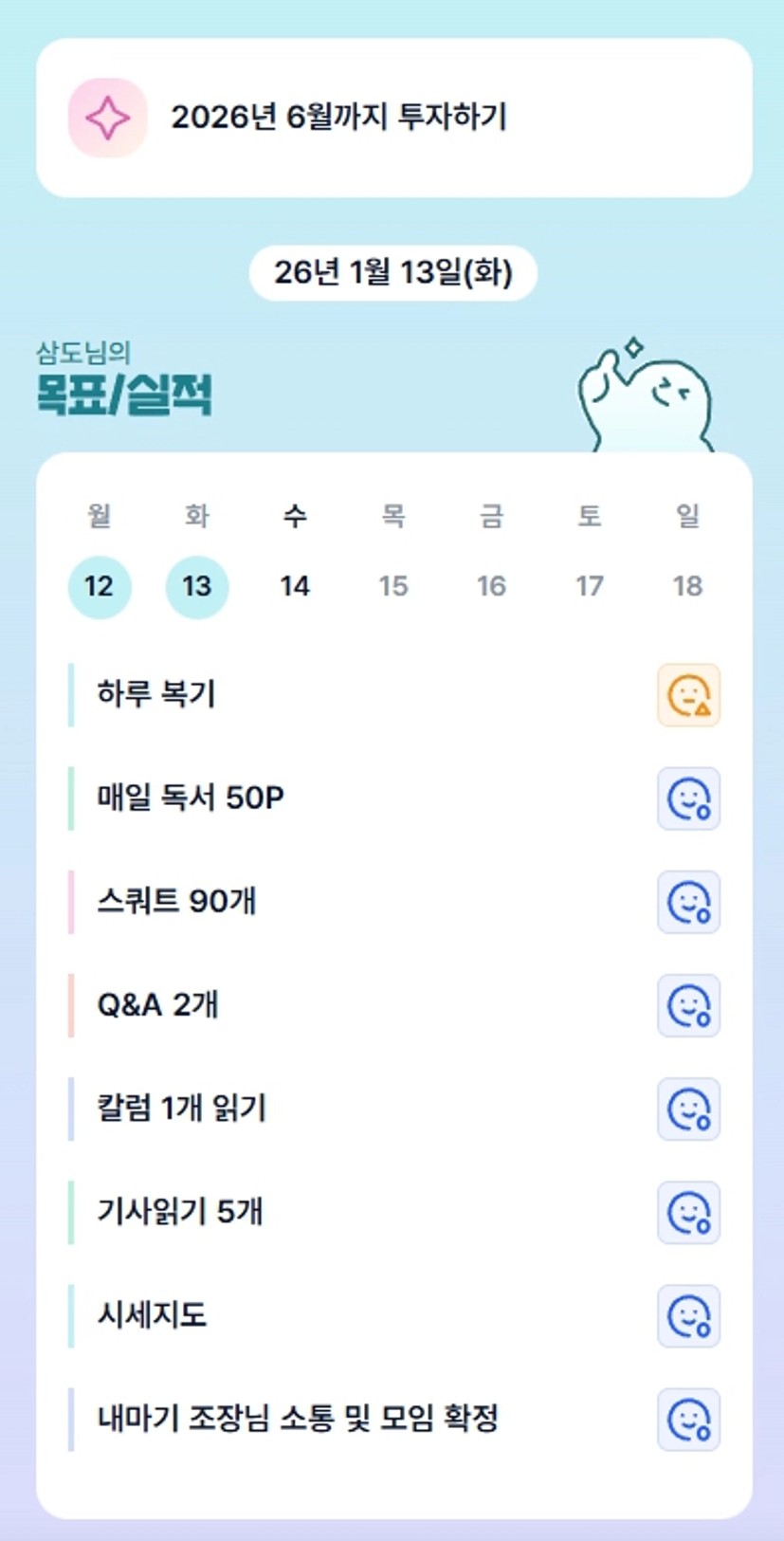 4. 공이님과 소통하며 투자에 어려운 부분에 대해서 이야기 나눌 수 있음에 감사합니다. 방법을 제시하는 것보다 경청과 용기, 응원을 더욱 드리도록 노력하겠습니다. 새벽 1시에도 통화 받아주시는 반장님 감사합니다. 이번 주말 붕싸만코 미리 감사합니다.
