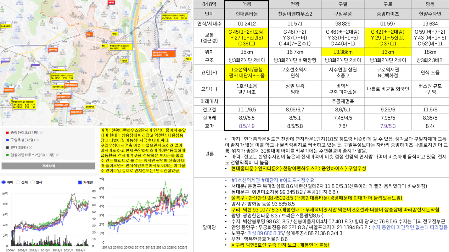 질문 던지기: "구로 현대 33평이 8.5억인데, 성북구 한신한진 33평도 8.5억이네? 어디 입지가 더 나중에도 가치가 높을까?"