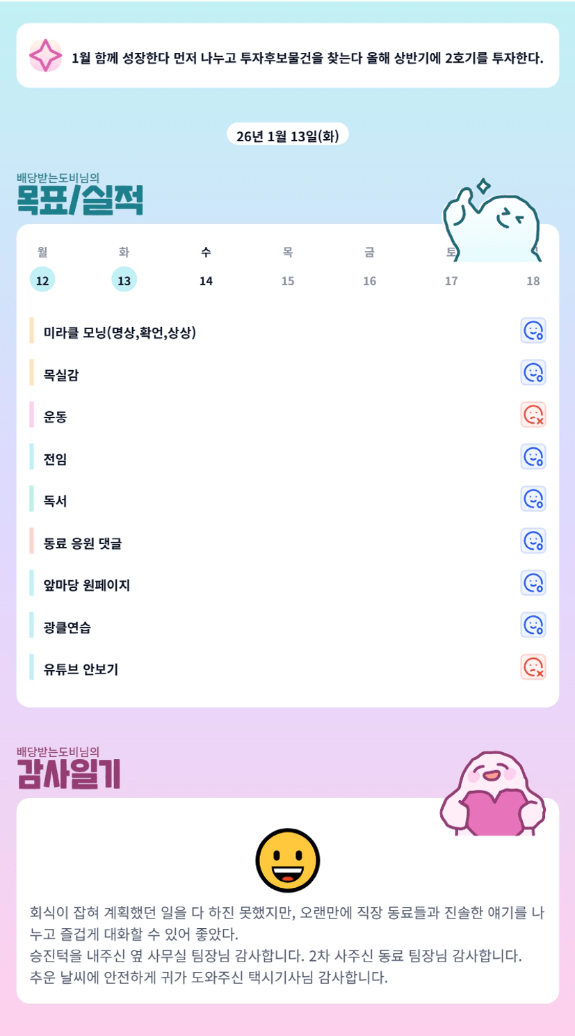 도비님 오랜만에 직장동료분들과 즐거운 시간 보내셨군요ㅎㅎ 질의응답 함께 못해 아쉬웠지만 매일 루틴 지켜나가시는 모습보며 저도 매일 배웁니다~^^ 이번주도 우리 화이팅해봐요!!:)