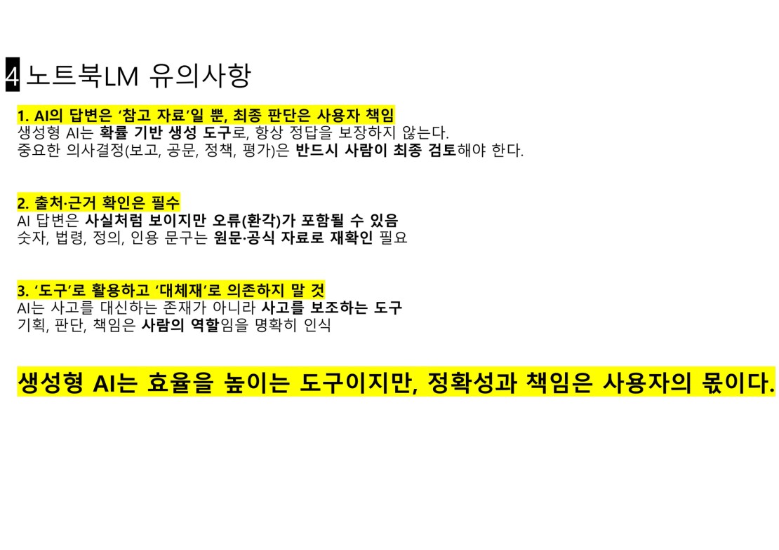 쉽게 말해 노트북 LM은 “내가 올린 자료만을 기반으로 답변해 주는 문서 전용 AI 노트 도우미”입니다.