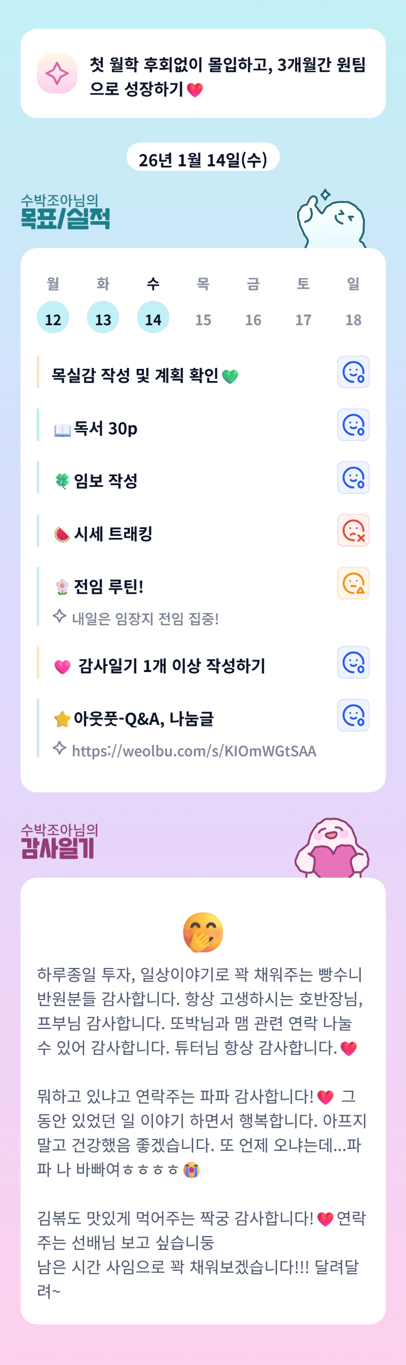 수부님~ 오늘도 고생 많으샸어요!! 빵순이들 위해 신경 많이 써주셔서 감사합니다!!! (동료 목실감에 와서 감사일기 쓰기)