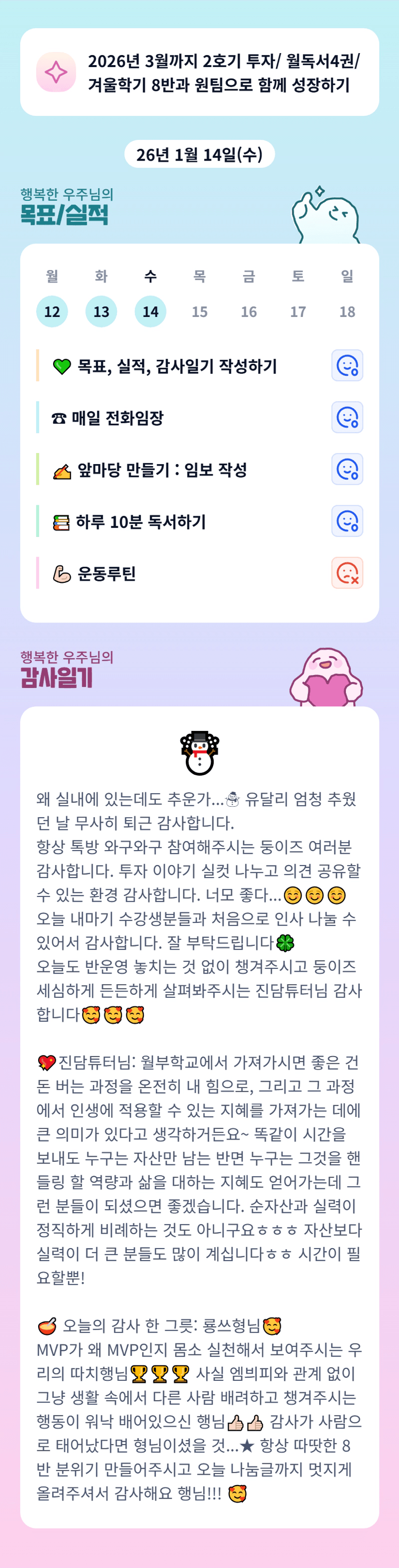 선배님 너무 고생 많으셨어요!!! MVP 대마왕께서 과하게 칭찬해주셔서 몸둘 바를 잘 모르겠습니다 😊 행부님!!! 다 좋은데 몸 아끼면서 본인이 가장 우선이라는 거 잊지 않고 하셨으면 해요!! 늘 감사하고 늘 고맙고 늘 케어해주셔서 감사합니다 😊
