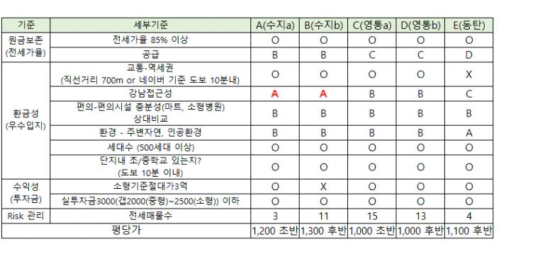 제 눈에 들어온 아파트는 전세가율 85% 이상, 역세권 (직선거리 800m or 도보 10분), 500세대 이상, 주변환경 양호, 초등학교를 걸어서 이용할 수 있는지, 1~3층 제외.. 등