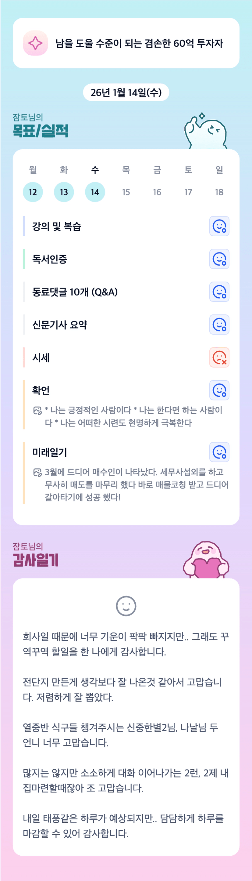 잠토님, 오늘 하루 수고 많으셨어요! 태풍 같은 하루가 예상되지만 태풍이 잠잠히 잘 지나가기를 바래봅니다. 힘내세요. 잠토님 :D