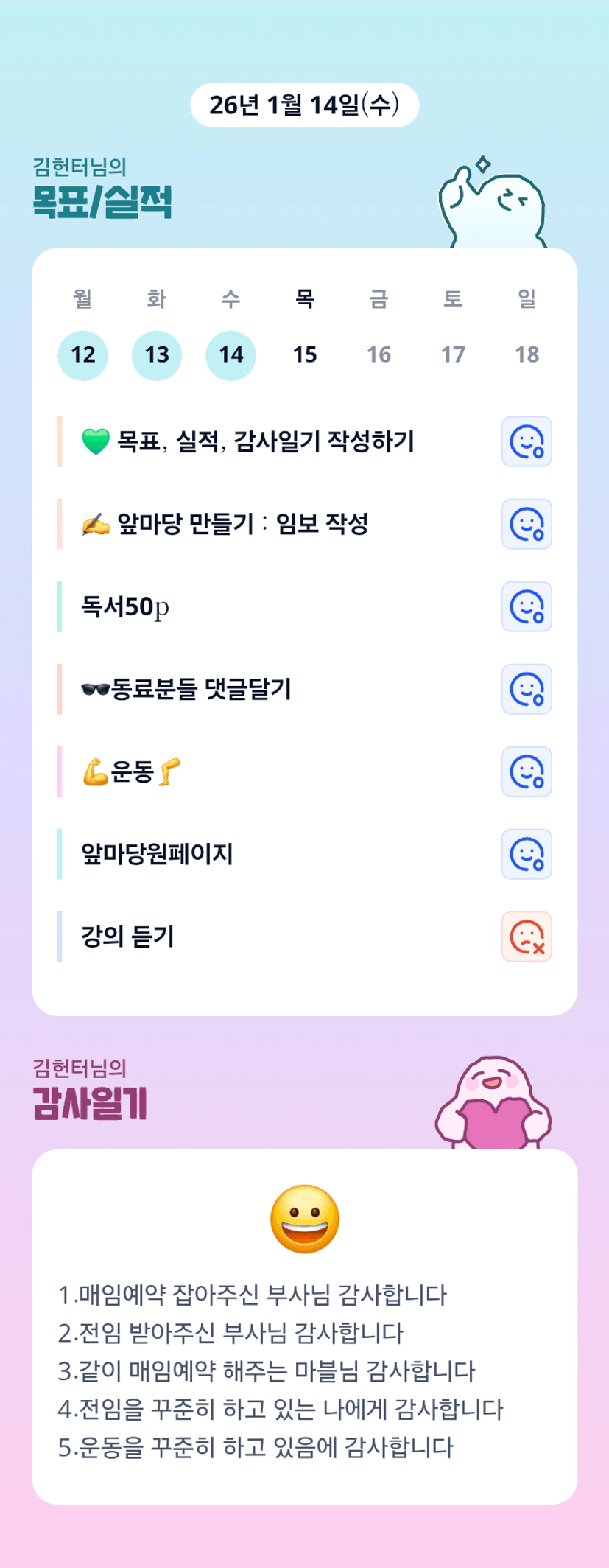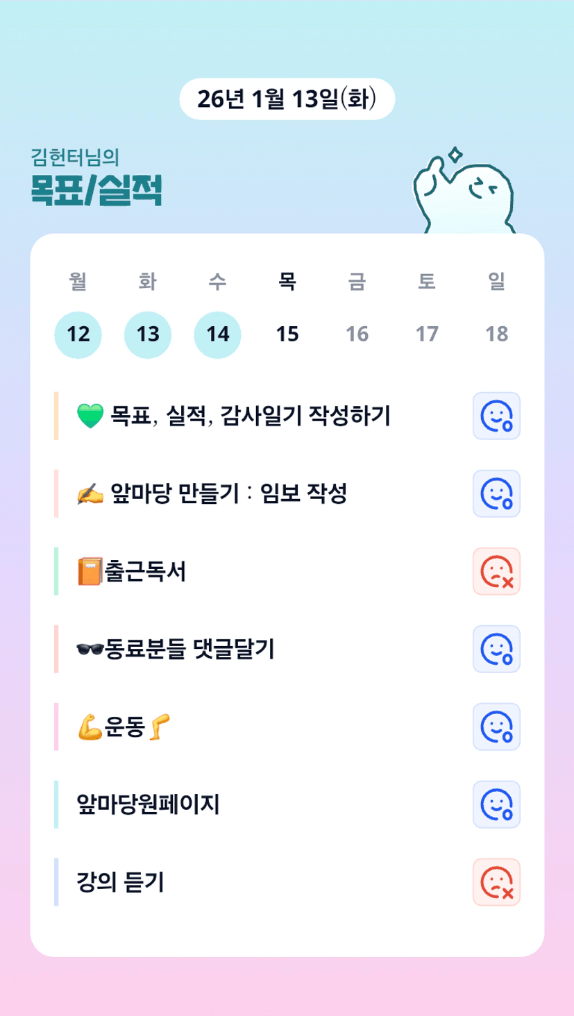 이렇게 바쁜데 운동도 원페이지도 잘챙기시는 우리 시니어슨배님ㅎ 👍 헌터님 오늘 마블님이랑 강의 잘듣고 오세용!!ㅎㅎㅎㅎ