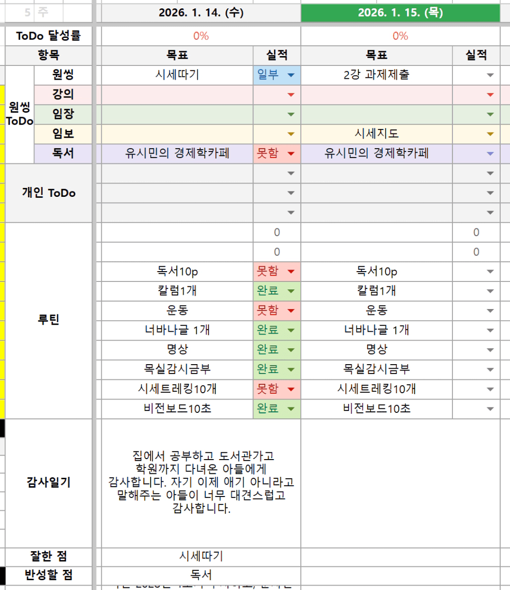 나는 건강한 사람이다.나는 부단히 노력하는 성실한 사람이다.나는 2026년 서울, 수도권 앞마당 10개 늘린다.나는 2028년 4호기 투자하고, 순자산 15억 달성한다.나는 2030년 5호기 투자한다.꾸준함은 성공의 최고 덕목이다. 나는 꾸준히해서 2035년 30억 부자가 된다.나 우가행은 해내는 사람이다.나는 한다.나는 해낸다.나는 반드시 된다.