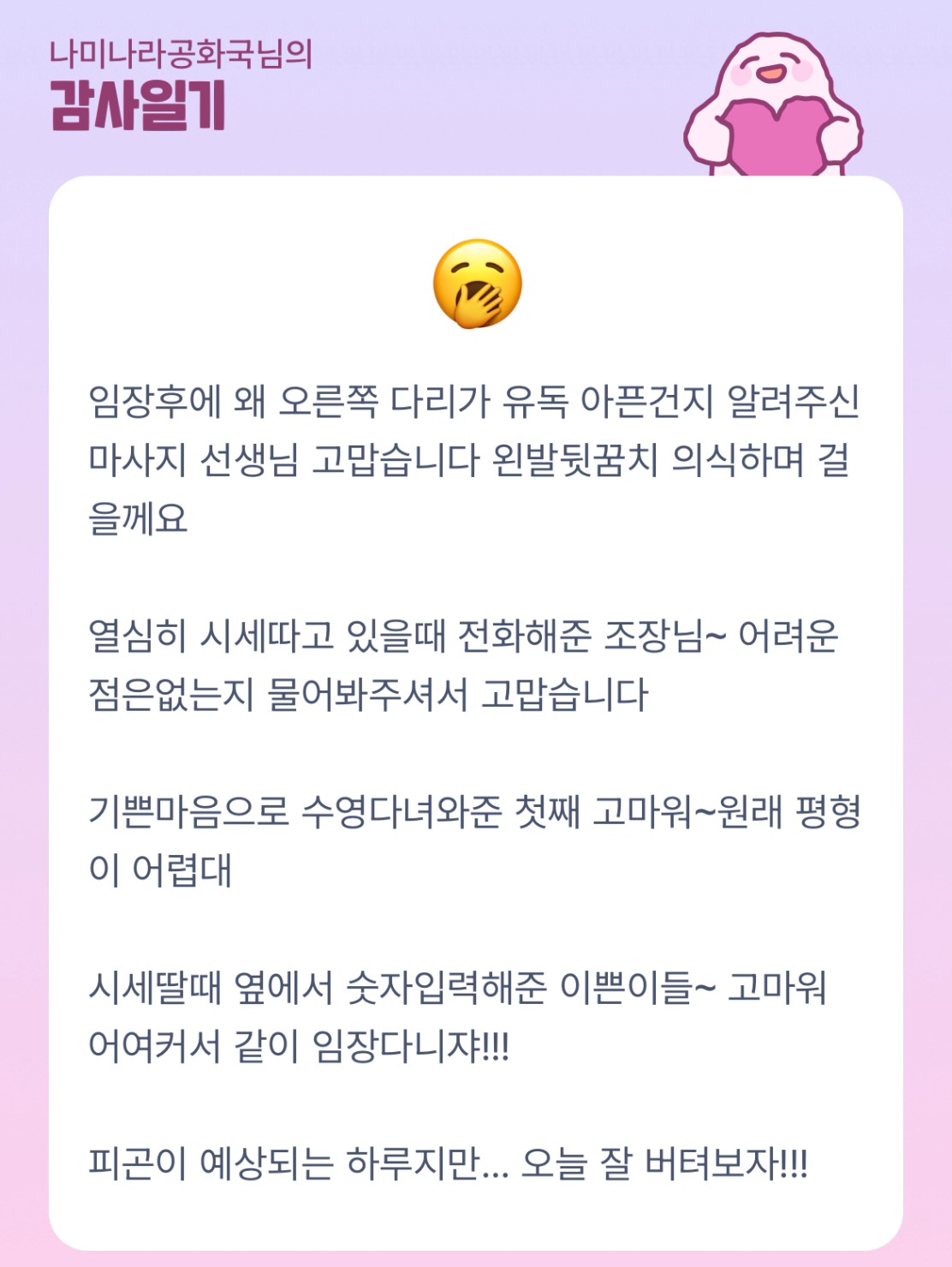 나나공님~ 토요일에 곧 임장인데 이번엔 다리 많이 안아프셨으면 좋겠어요ㅠㅠ 2주차 슬슬 피로가 쌓일 시기지만 힘내세요!