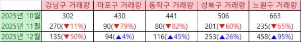 최근 강남구의 거래량은 줄어들고 노원구의 거래량은