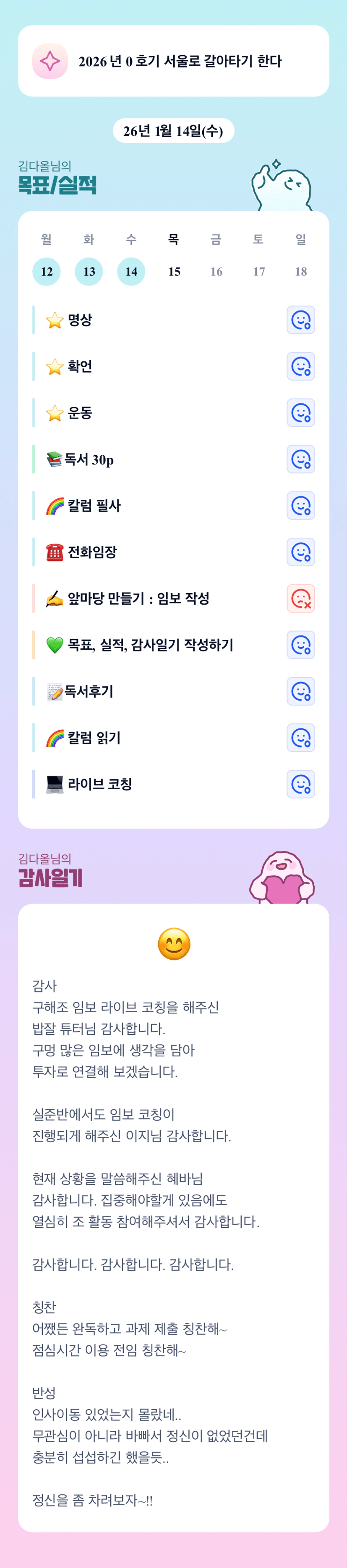 꾸준한 다올님.. 멋져... 열심히하다보면 놓치는게 많이 생기는거 같아여 ㅜㅜ 그래도 역지사지 잘 이해보려고 하는 모습 멋지닷!!