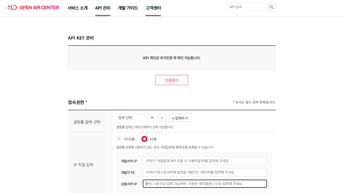 업체는 선택하지 않고 그대로 두신 상황에서 개발서버, 개발자 피시, 사용서버 아이피에 기존과 동일하게 모두 내 아이피 주소를 입력해주시면 됩니다. 그리고 상단에 있는 인증하기 버튼을 누르면 내 api값을 확인하실 수 있으실거에요