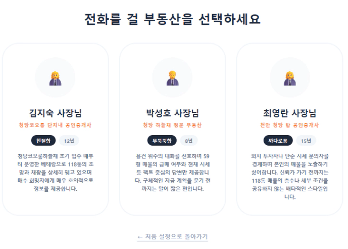 1. 링크 타고 들어가시면 아래와 같이 설정창이 나와요. 여기서 원하시는 것 고르시면 3명의 부동산 사장님 페르소나를 만들어줘요.