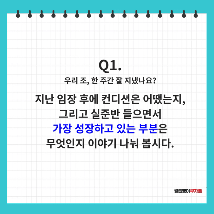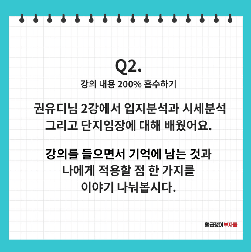 먼저 각자 성장한 부분에 대해서 얘기를 나누었다. 부산에 거주함에도 부산에 어떤 아파트가 유명하고 어떤 곳이 선호도가 있는지를 모르는 나와 달리 척척 의견을 공유해주시고 부산 거주민으로서 알고 있는 점을 말씀해주시는 조원분들을 보며 난 왜 아무것도 모르지..? 라는 의문점과 단임 이후에 어떤 단지가 좋았냐는 질문에도 척척 대답하는 조원분들과 달리 가물가물한 상태로 어물쩍 대답한 나의 모습을 보며 부족함을 느낀 것이 사실이다. 다만 이전같았으면 게으른 완벽주의자인 사실상 아무것도 하지않는 예전 성향에 아 역시 난 이길이 아닌가봐 그냥 그만둘까라는 생각과 동시에 월부를 떠났을지도 모르지만 몇 안되는 강의를 거쳐오며 NOT A BUT B와 완벽주의가 아닌 완료주의를 계속 새겼다보니 관심이 없었으니 몰랐을수도 있지! 처음인데 뭐 어때 하는 게 중요하지 이제 알아가면 되지! 라는 마음으로 포기하지 않고 느리지만 조금씩 성장해보자 라는 건강한 마인드를 갖게 된 것이 내가 성장한 부분이라고 생각이 든다고 말씀드렸다.