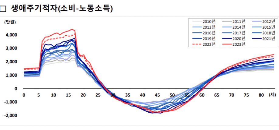 흑자기간이 늘고, 노동소득의 정점이 늦어지고, 은퇴연령이 늦어지는것은 개인관점에서 희망적이다. 다만 자식세대의 적자 폭이 커지는 것은 절망적이다. 아이는 점점 적게 나으면서 그 아이에게 들어가는 투자는 점점 늘어나는 것을 볼수 있다.