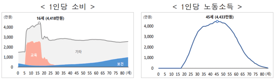 10대가 인생 최대 적자구간이다. 이는 대부분 교육비가 차지하는 것으로 보인다. 일종의 인간R&D비용이다. 우리나라는 사교육을 죄악시 하지만, 사실 사교육은 전세계 상류층의 공통된 현상이다. 다만 우리나라의 차이는 경제력이 있는 사람들만 결혼하고 아이를 낳는다는 경향이 유독 강하다는 것이 차이고, 그 결과 대부분의 아이들은 사교육을 받는다. 보건비용은 20~25세에 저점을 맞이하고 이후 지속적으로 증가한다. 특히 60~65세 구간에는 살짝 구부러지면서 올라가는데 대부분의 건강수명이 70대초반까지인 것을 고려하면 상당히 맞아떨어지는 통계다.