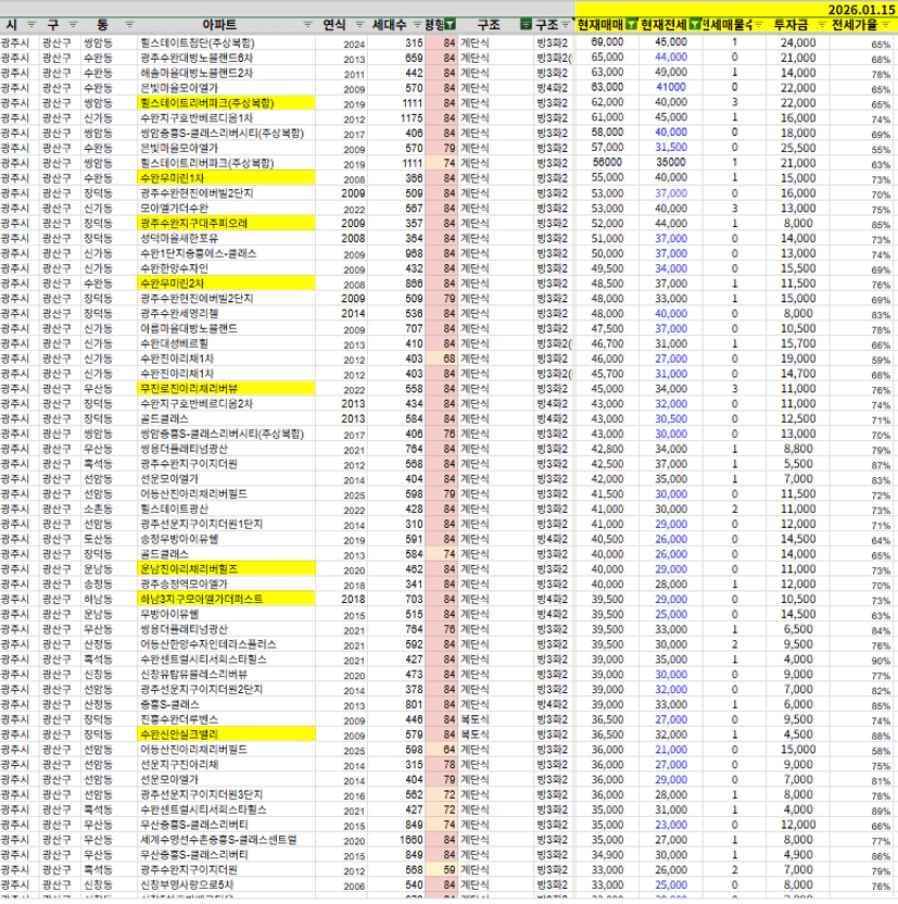 지난 달과 비교해서 큰 차이는 없지만, 수완지구는 전반적으로 1~2천 정도 상승한듯