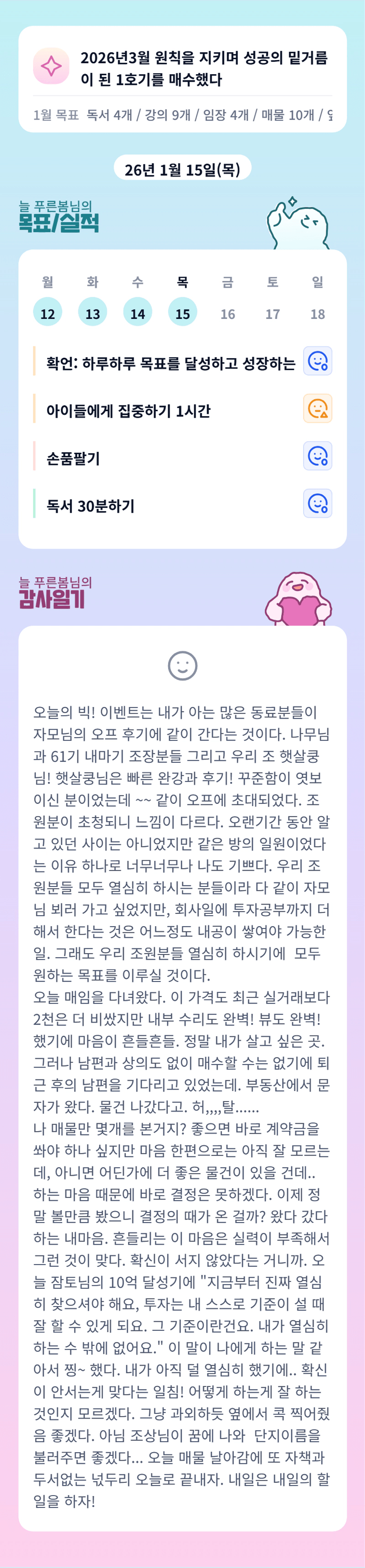 놓치거나 손에 닿을듯 말듯한 경험이 몇번 쌓인 뒤에 만난 매물에서 딱 계약금 넣는 것 같아요. 오늘도 다 좋은 경험이었을 거에요. 저는 봄님 하실수 있다고 믿습니다!