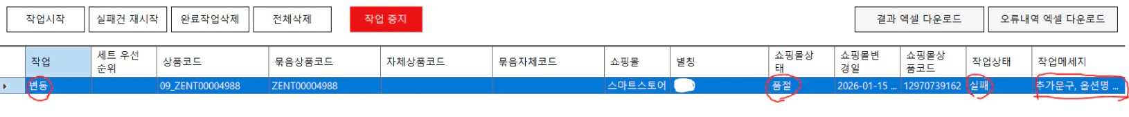 실패한 항목을 확인해보니, 상품 옵션 중 하나가 품절이 된 거 같더라고요
